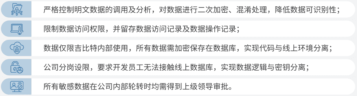 公司对用户个人信息实施脱敏处理,,,,严格限制用户信息用途,,,,数据使用完成后集中归档处理。。为进一步确保数据处理过程的安全,,,公司根据实际的业务工作分岗设限,,最大程度保护数据隐私安全,,如在生产网络中的加密数据由研发部门员工负责编写加、、解密程序,,,,但其无法直接访问到加密后的数据库;程序的加、、、、解密密钥由运维员工单独配置。。。。