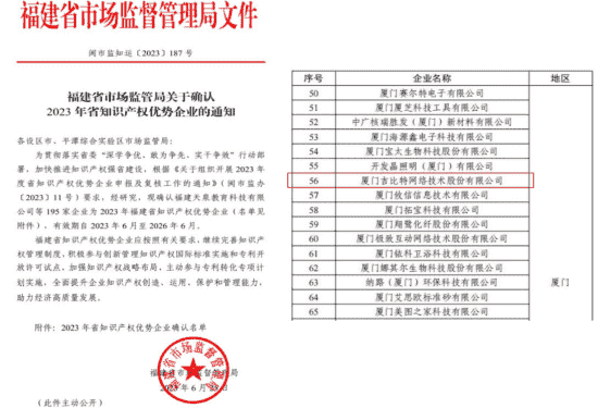 近日,,福建省市场监督管理局公示了2023年福建省知识产权优势企业名单,,厦门918.com网络技术股份有限公司(以下简称“918.com”或“公司”)榜上有名。。。